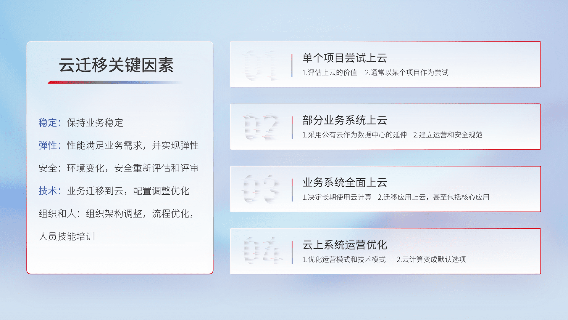 结合实际业务,,,从规划设计、、、云平台选型、、云原生改造、、、、数据迁移、、、、集成交付,,,迁移全过程为客户识别最佳上云路径,,,做好风险识别管理,,,,设计网络架构、、、身份权限、、、、安全审计合规、、、操作审计、、日志审计、、、监控告警策略、、、多站点容灾设计等,,,对云上基础设施进行整体规划,,,,提升IT治理水平,,,以满足弹性、、、、高可用、、、高性能的需求。。