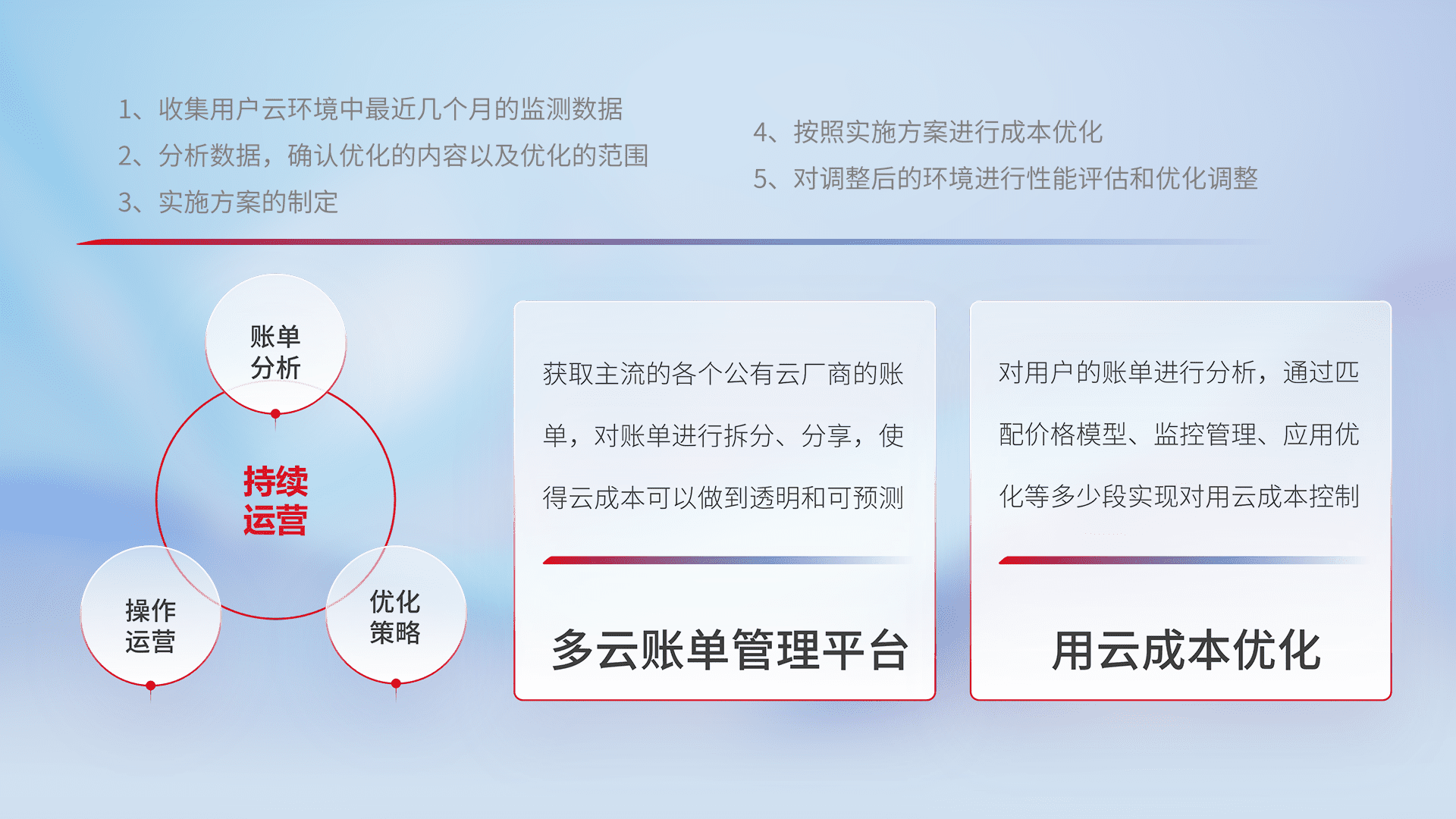 通过多云纳管,,,以统一的资源数据模型把客户的云资源进行抽象和封装,,,,进而实现对多云资源的统一操作,,保障云资源管理的可靠性、、、、稳定性与可用性。。量身定制化运维内容,,配置、、开发运维、、、补丁管理、、备份、、、监控、、、认证和访问管理、、审计和日常巡检等,,,保障在用云过程中的可靠度,,,,稳定度以及高可用率。。。